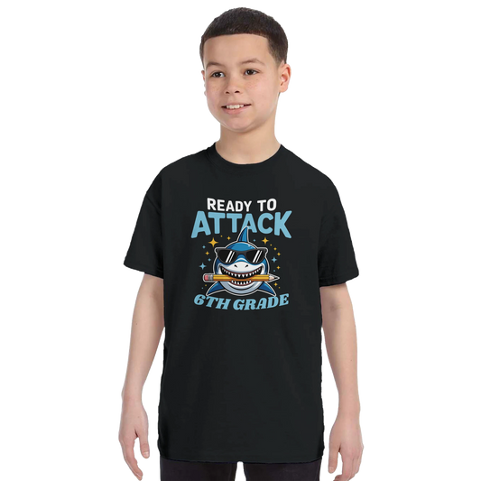 Classic Kids Crewneck T-Shirt – "Ready to Attack" Blue Shark – Customizable for 1st to 6th Grade – Bold & Fun School Shirt