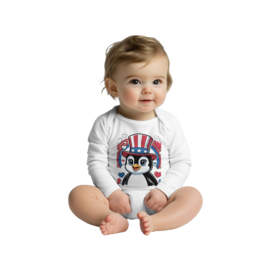 Patriotic Penguin 4th of July Baby Long Sleeve Bodysuit | Soft 100% Cotton | Cozy & Easy Dress