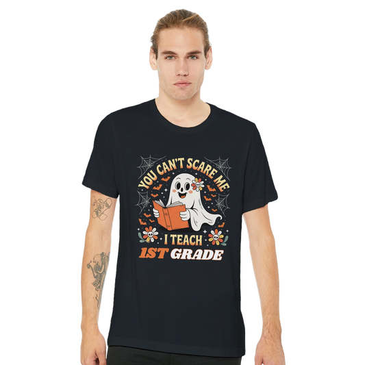 Premium Unisex Crewneck T-shirt – Halloween Ghost "You Can’t Scare Me, I Teach [Grade] Grade" – Customizable Teacher Shirt (1st to 6th Grade)