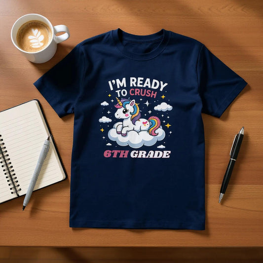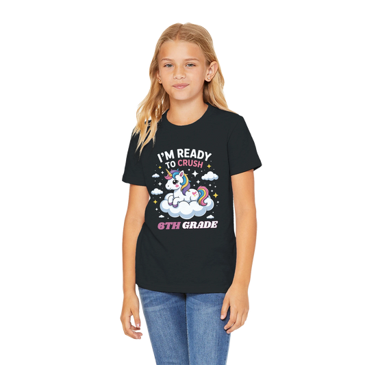 Premium Kids Crewneck T-shirt – Cute Kawaii Unicorn "I’m Ready to Crush" – Rainbow Mane, Magical Stars & Clouds – Back to School Outfit