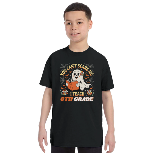 Classic Kids Crewneck T-shirt – Halloween Ghost "You Can’t Scare Me, I Teach [Grade] Grade" – Customizable Teacher & Classroom Shirt (1st to 6th Grade)