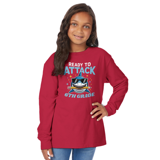Kids Long Sleeve Crewneck T-Shirt – "Ready to Attack" Blue Shark – Customizable for 1st to 6th Grade – Bold & Fun School Shirt