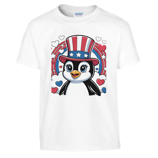 Patriotic Penguin 4th of July Kids T-Shirt | Classic Crewneck | Durable & Soft Heavyweight Fabric