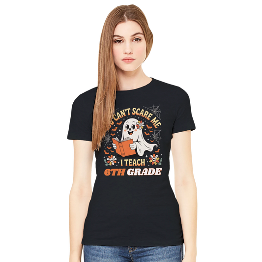Premium Women’s Crewneck T-shirt – Halloween Ghost "You Can’t Scare Me, I Teach [Grade] Grade" – Customizable Teacher Shirt (1st to 6th Grade)