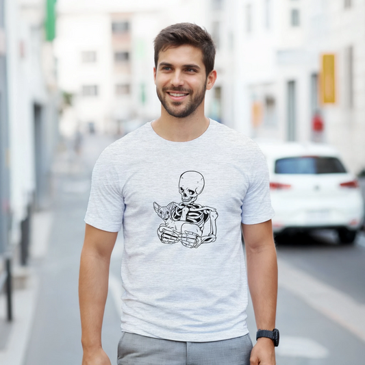 Skeleton with Cat Halloween T-Shirt – Gothic Sphynx Cat Graphic Tee | Heavyweight Unisex Crewneck