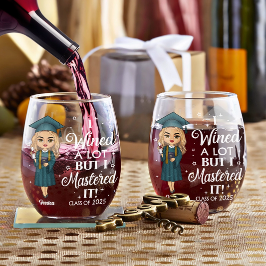 Personalized “I Wined A Lot But I Mastered It” Stemless Wine Glass – Funny Graduation Gift for Wine Lovers, College Grads & Professionals – Custom Name Glass 15oz