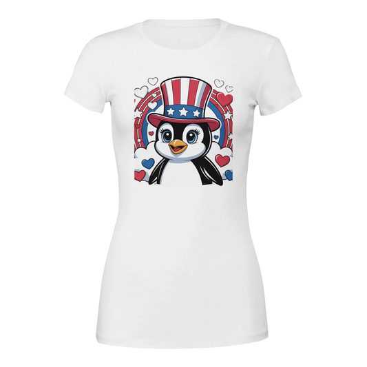 T-shirt patriótica para mulher com pinguim para o 4 de julho | Gola redonda premium com corte slim | Mistura de algodão macio Airlume